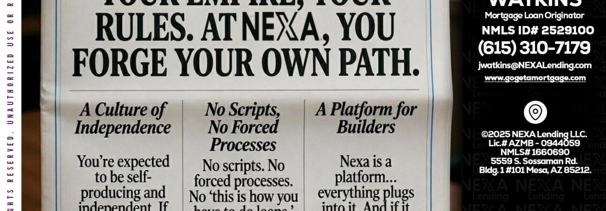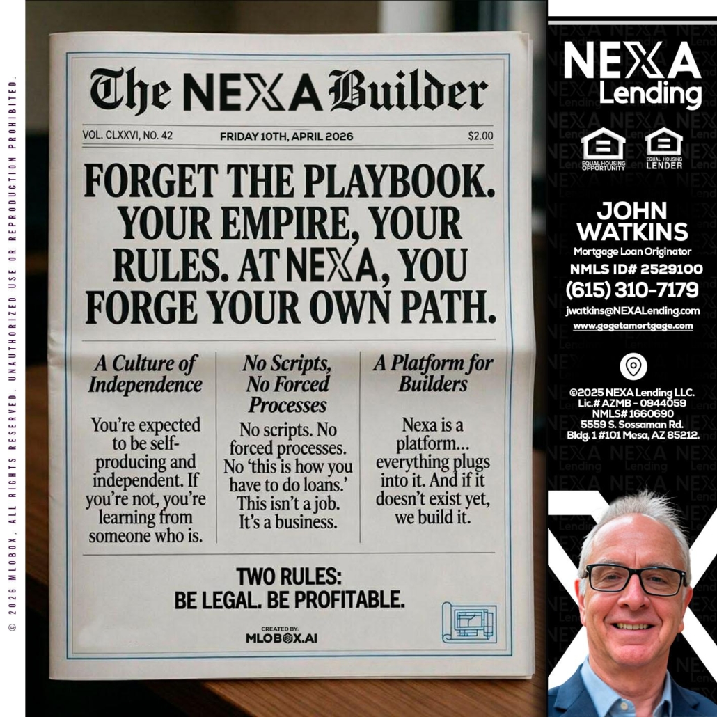 THE NEXA BUILDER - John Watkins -Mortgage Loan OriginatorHi, my name is John Watkins. I’m a Loan Officer with NEXA Lending LLC., offering personalized mortgage solutions, fast customized quotes, great rates and service with integrity.